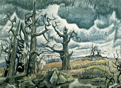 Charles Burchfield (1893-1967), estadounidense. Es un pintor de acuarelas reconocido por sus paisajes rurales y urbanos realizados con cierto misticismo y constantes sugerencias que llevan a pensar que trata de decir "algo más" de lo que describe en la imagen.